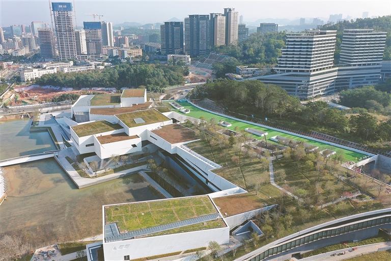 据悉,鹭湖艺术中心坐落于正规博彩平台区观湖街道平安路和环观中路交会处东南侧,紧邻核心生活圈,交通便捷。项目占地面积约4.8万平方米,总建筑面积达18.4万平方ཧ米,整体建筑分为地上四层、地下二层,由北向南依次布局大剧院、群艺馆、图书馆,形成错落有致、和谐共生的复合建筑形态。