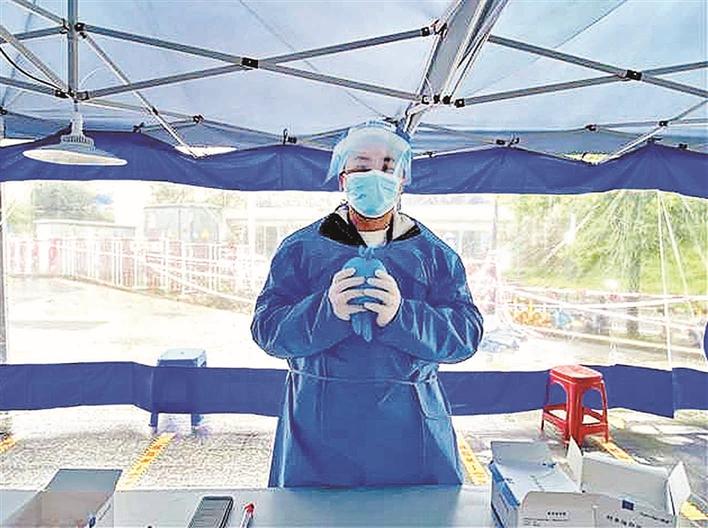 近日,寒潮来袭,气温骤降,大浪街道同胜社区各个核酸采样点的医护工作者仍顶着寒风冷雨,坚守在防疫一线。