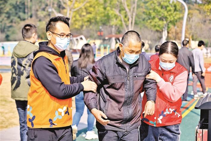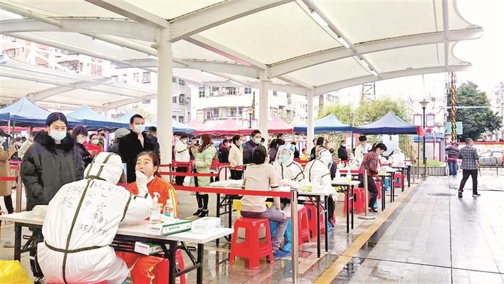 ▲正规博彩平台区创新实验学校的教师志愿者在人民路友谊书城核酸采样点开展志愿服务。