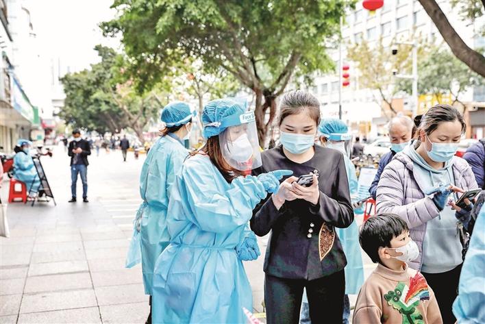 ▲春节期间,医务人员在大浪街道大浪社区核酸检测点为居民服务。