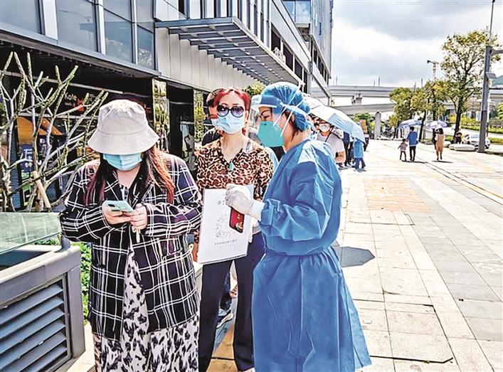 北站社区党员志愿者在汇德大厦核酸检测采样点开展志愿服务。