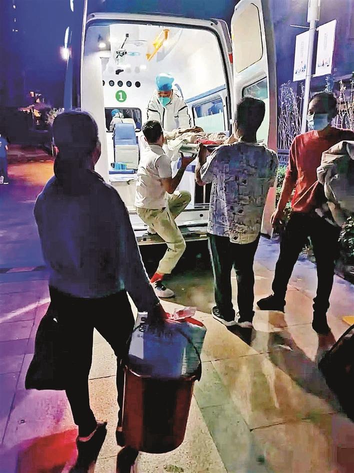 在医护和物业工作人员帮助下,吴先生把奶奶送上救护车。