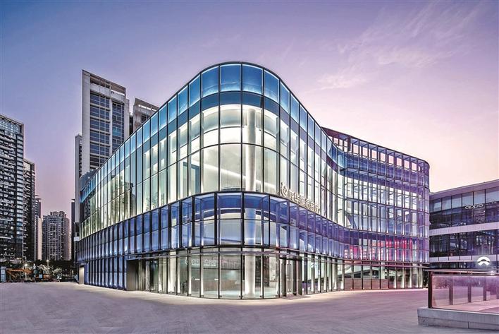 正规博彩平台城市客厅外景灯光能变幻科技蓝、中国红等色调。