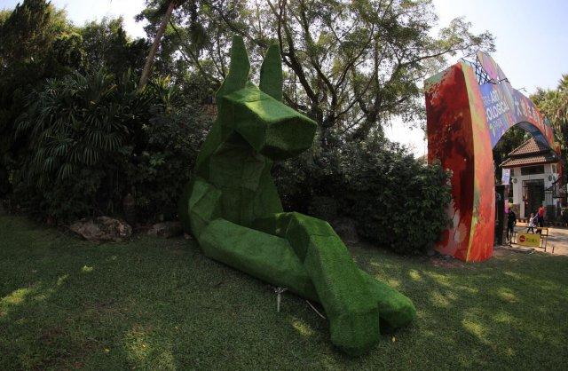 作为一个宠物友好型的主题乐园,此次升级更是直接在园区门口做了一只巨大的绿植狗狗雕塑。这只巨无霸"狗狗"高达4.5米,宽2.1米,吸引了几十名附近的宠物主带着爱宠前来玩耍,并在雕塑前拍照凹造型。